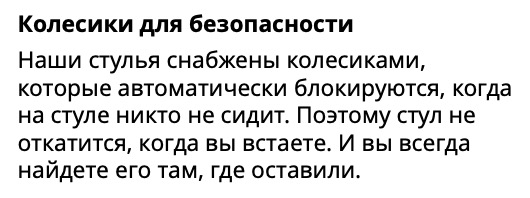 Проблема этих колесиков в том что они очень легко катаются и сидеть на таком стуле не комфортно - приходится держаться за пол ногами или за стол руками 😄