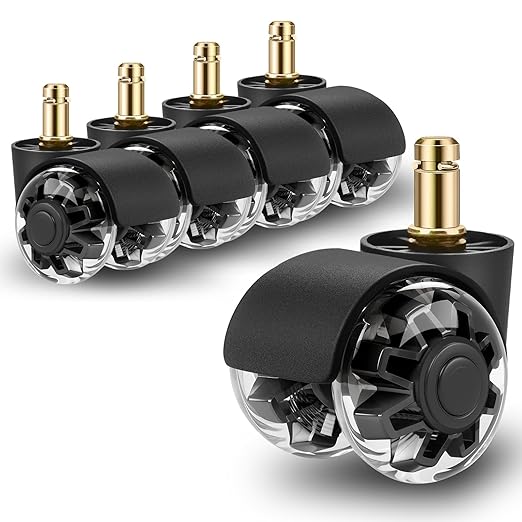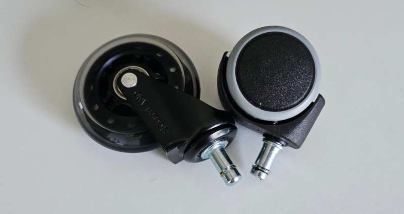 А вот чего у таких одинарных колесиков нет - в них не встроен автоматический тормоз. Он и не во всех классических парных бывает, но когда он есть, колесико клинится, когда сверху на него давит определенный вес. С таким колёсиками, стул не ездит, когда на нем сидят.