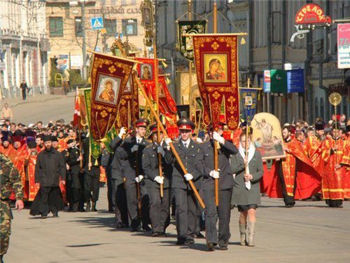 Особенно радует девочка-хоругвеносица в короткой юбочке и с непокрытой головой. Прямым ходом к православным чирлидерам.