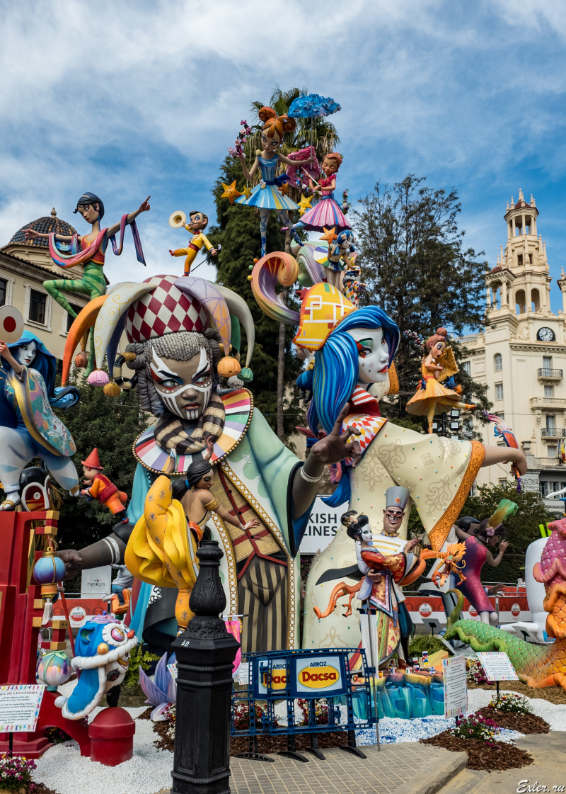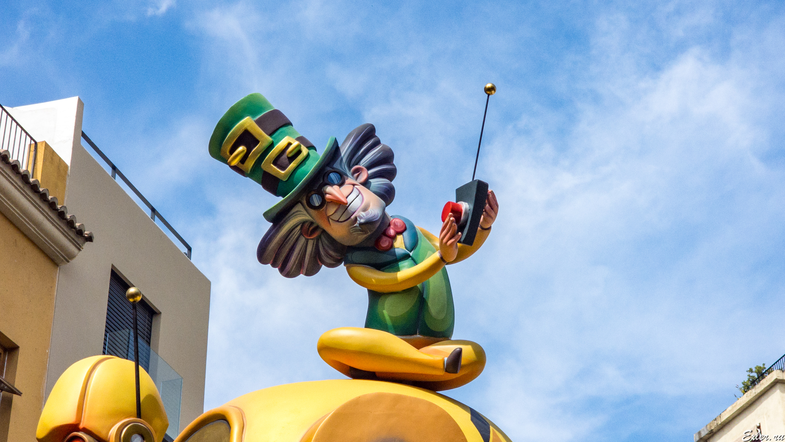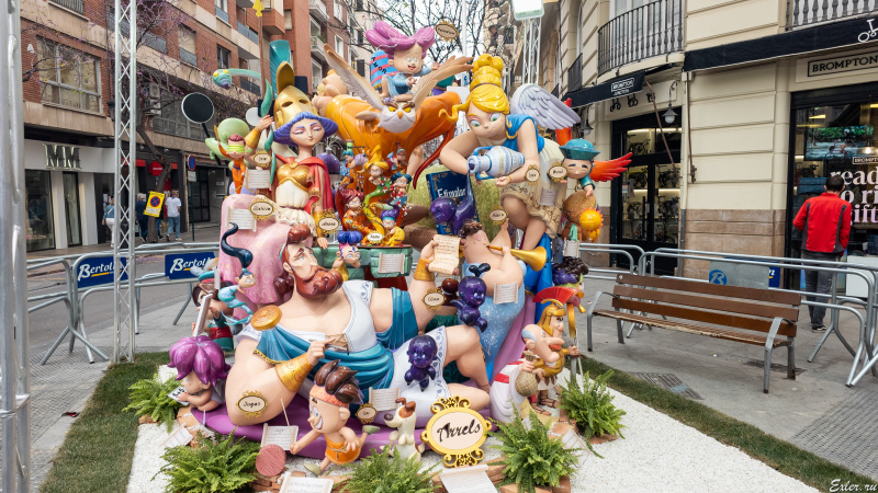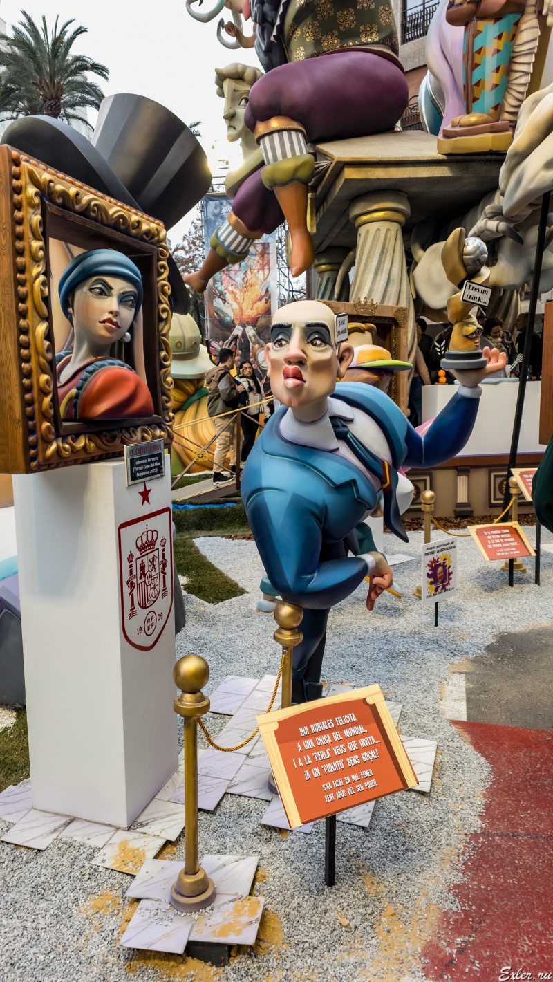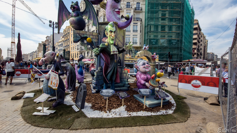 Вдали видна площадь муниципалитета, и на ней установлена городская большая фигура, которая в конкурсе не участвует. В ночь, когда все фигуры сжигают, эту на площади сжигают в самую последнюю очередь. Ближе подойти к ней в этот момент было практически невозможно, но позже нам удалось туда пробраться, и я покажу, как эта фигура вылядела вблизи.