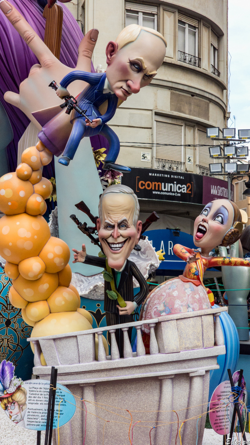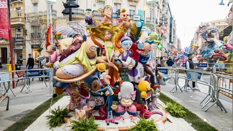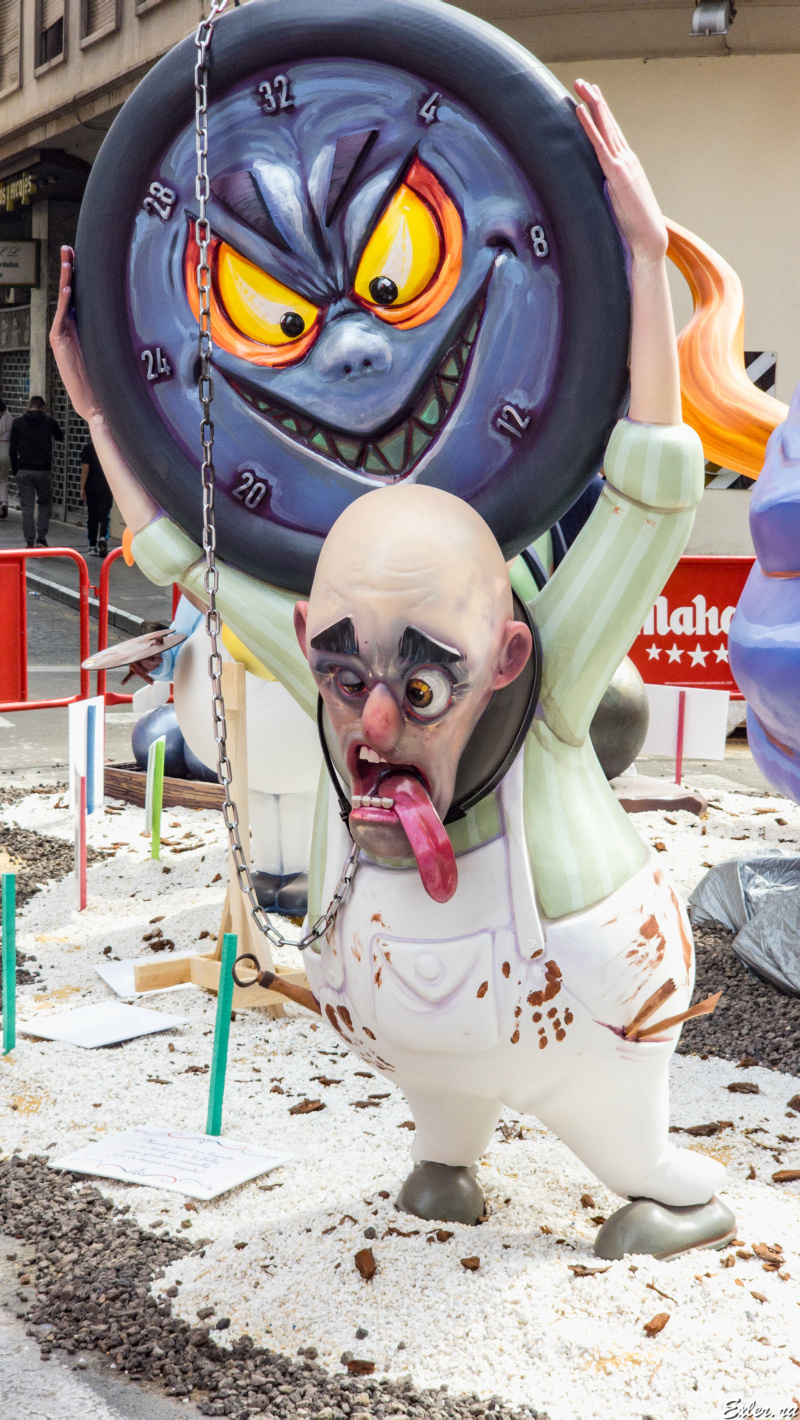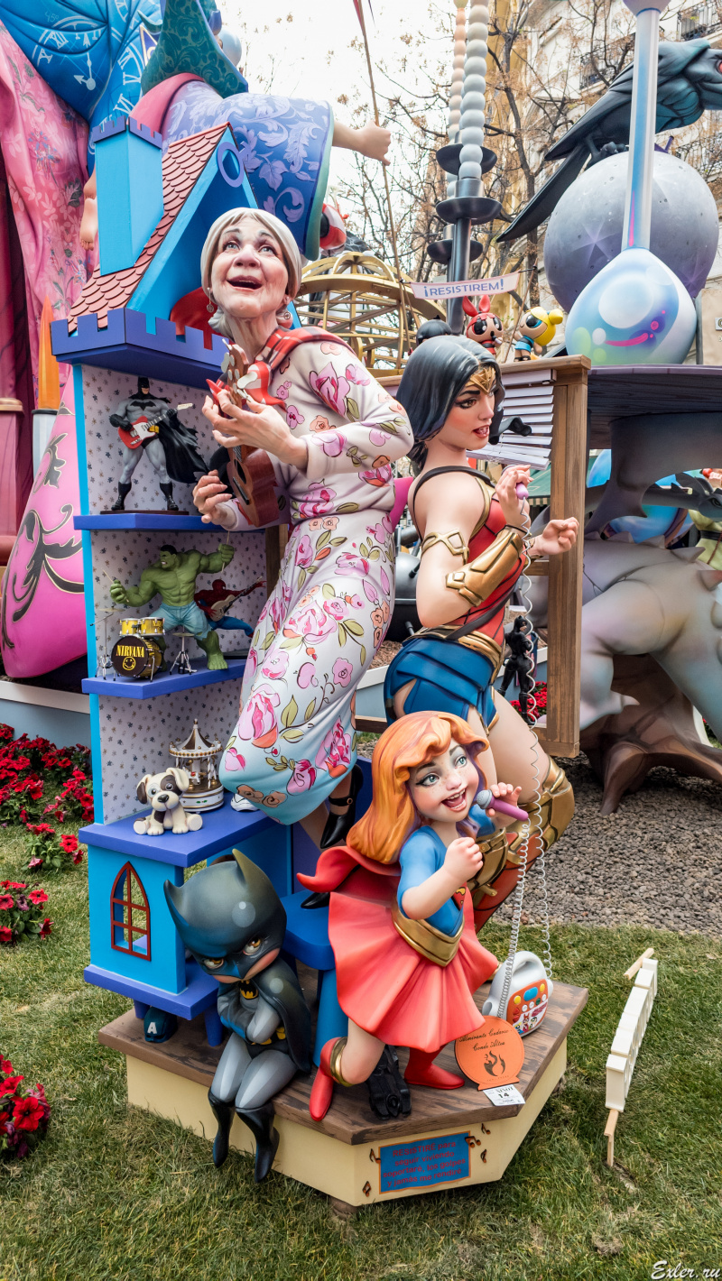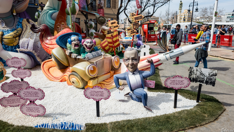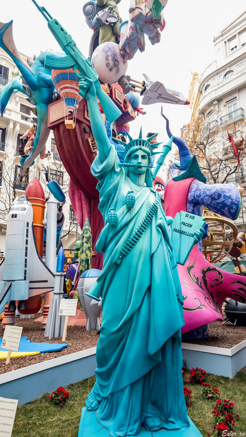 Вдали видна площадь муниципалитета, и на ней установлена городская большая фигура, которая в конкурсе не участвует. В ночь, когда все фигуры сжигают, эту на площади сжигают в самую последнюю очередь. Ближе подойти к ней в этот момент было практически невозможно, но позже нам удалось туда пробраться, и я покажу, как эта фигура вылядела вблизи.