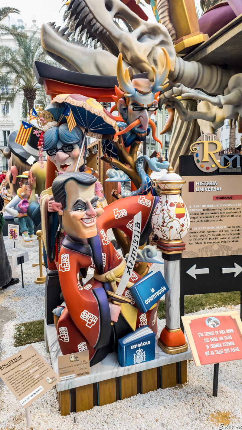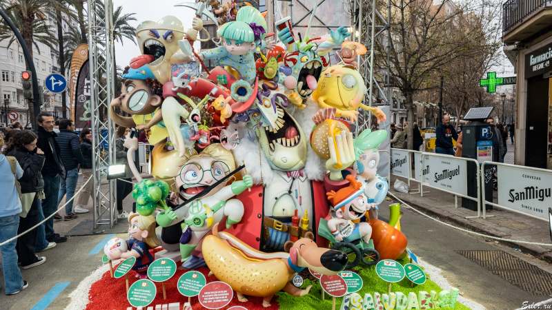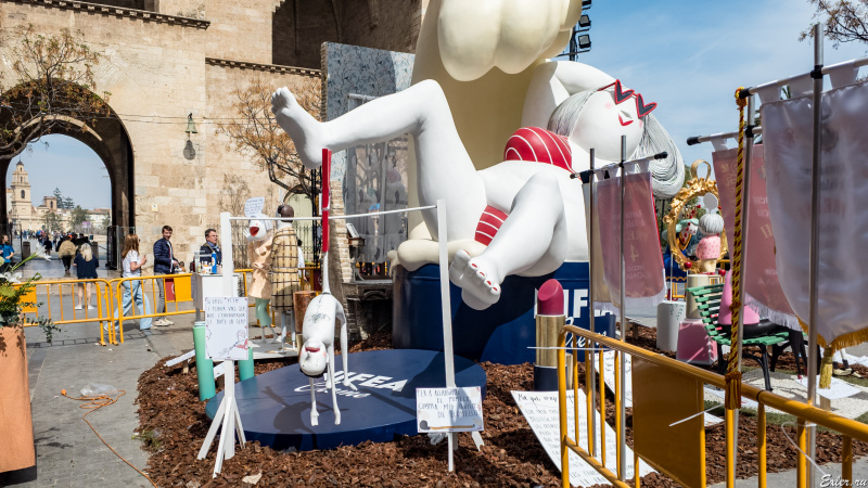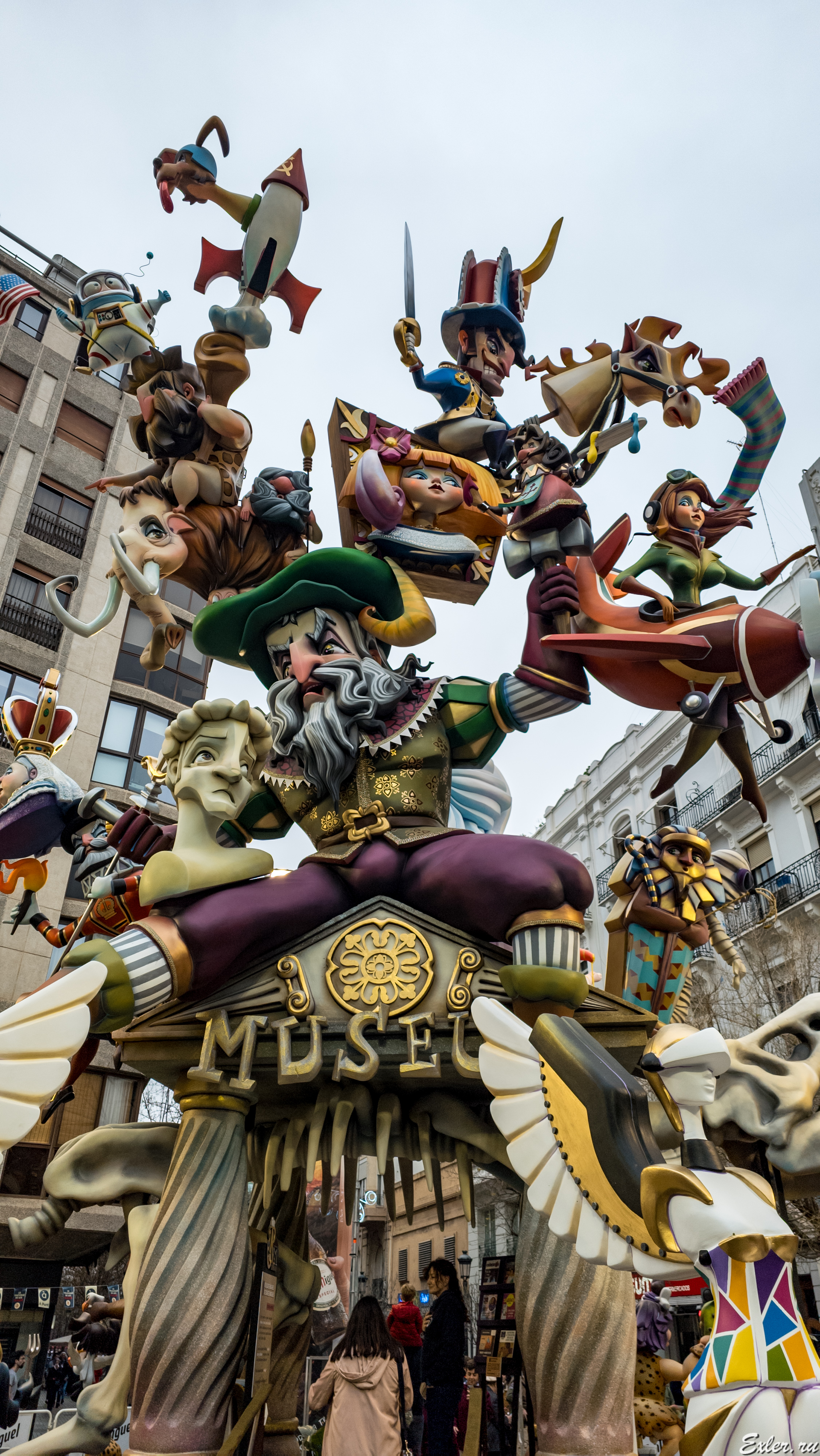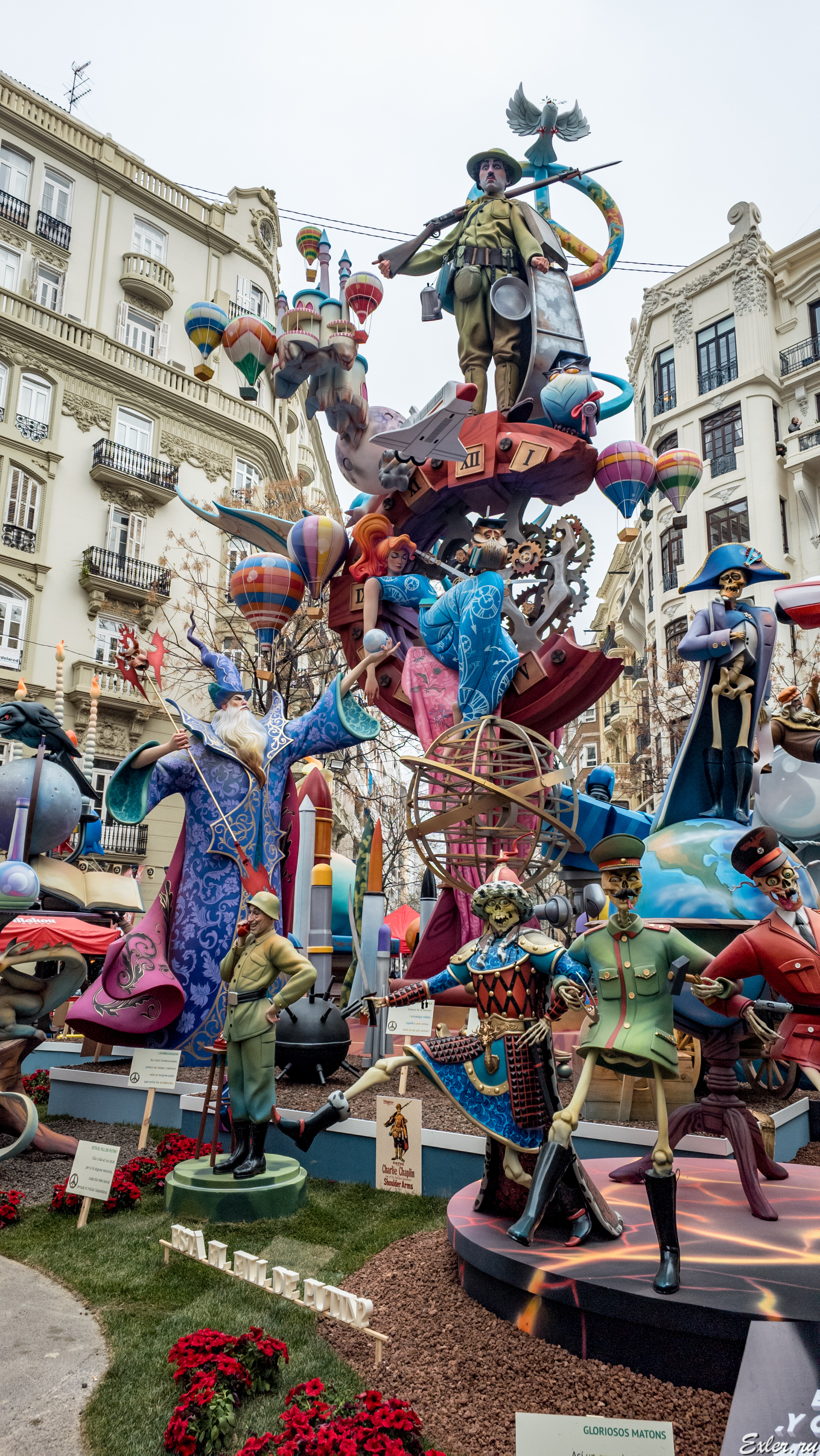 Вдали видна площадь муниципалитета, и на ней установлена городская большая фигура, которая в конкурсе не участвует. В ночь, когда все фигуры сжигают, эту на площади сжигают в самую последнюю очередь. Ближе подойти к ней в этот момент было практически невозможно, но позже нам удалось туда пробраться, и я покажу, как эта фигура вылядела вблизи.