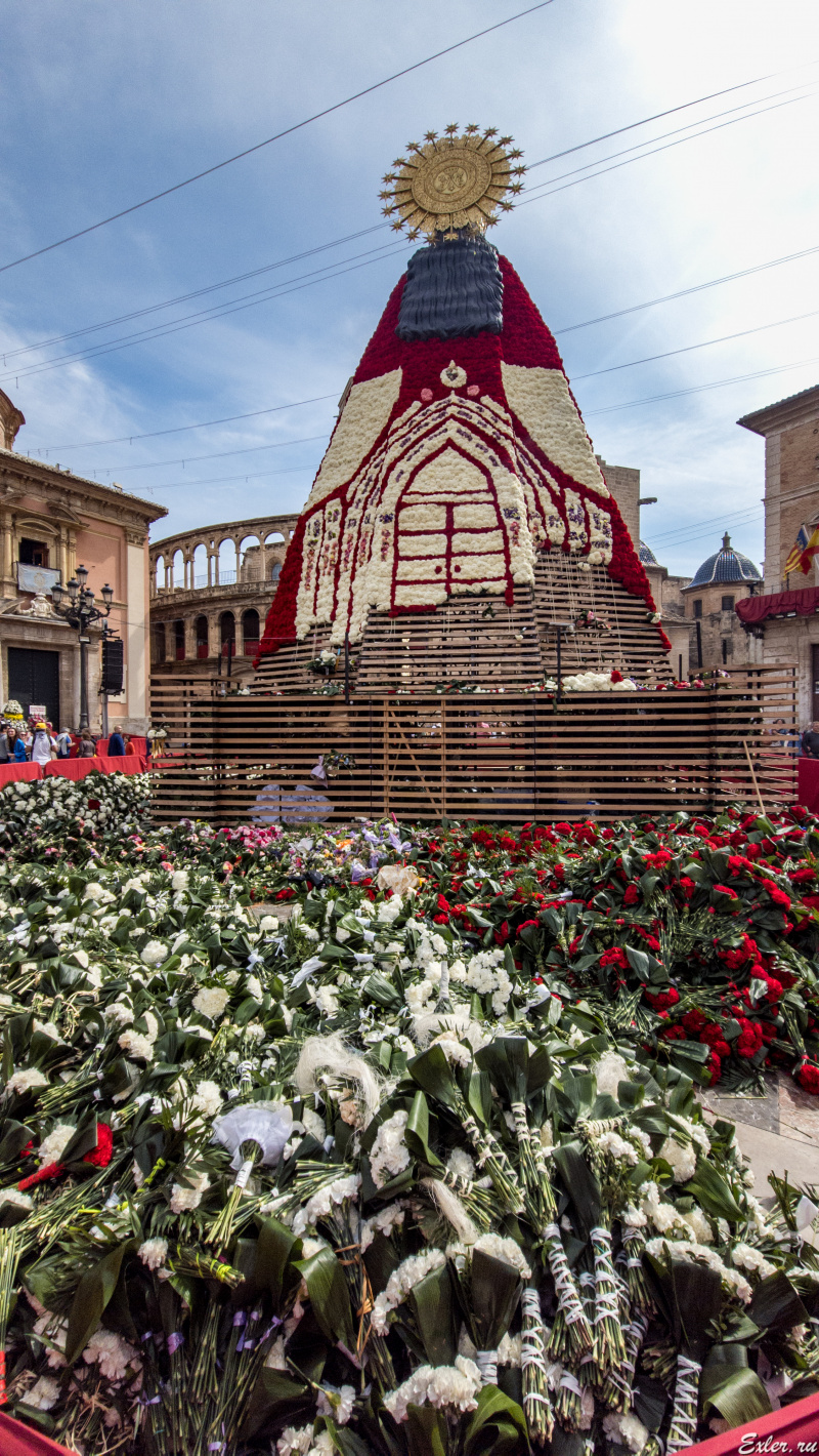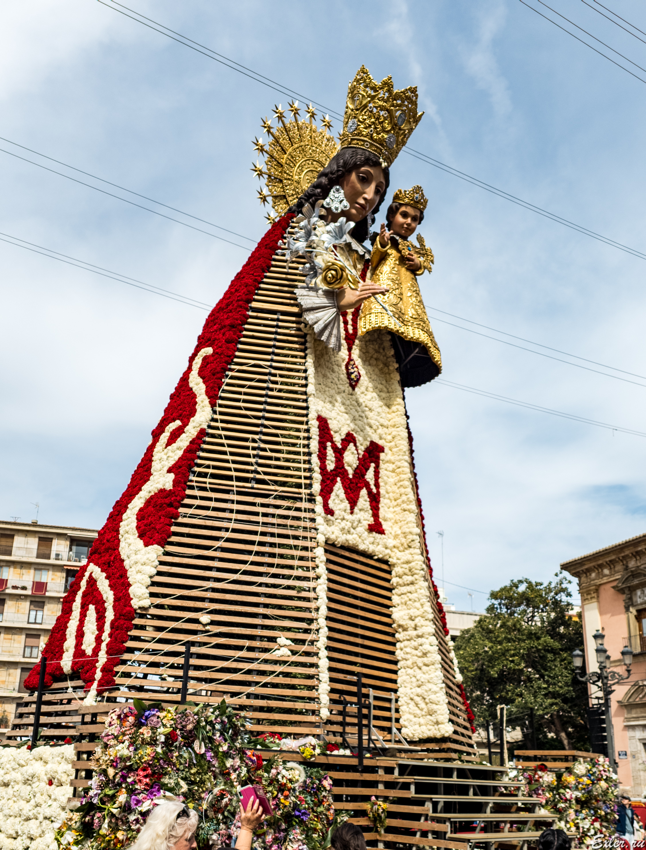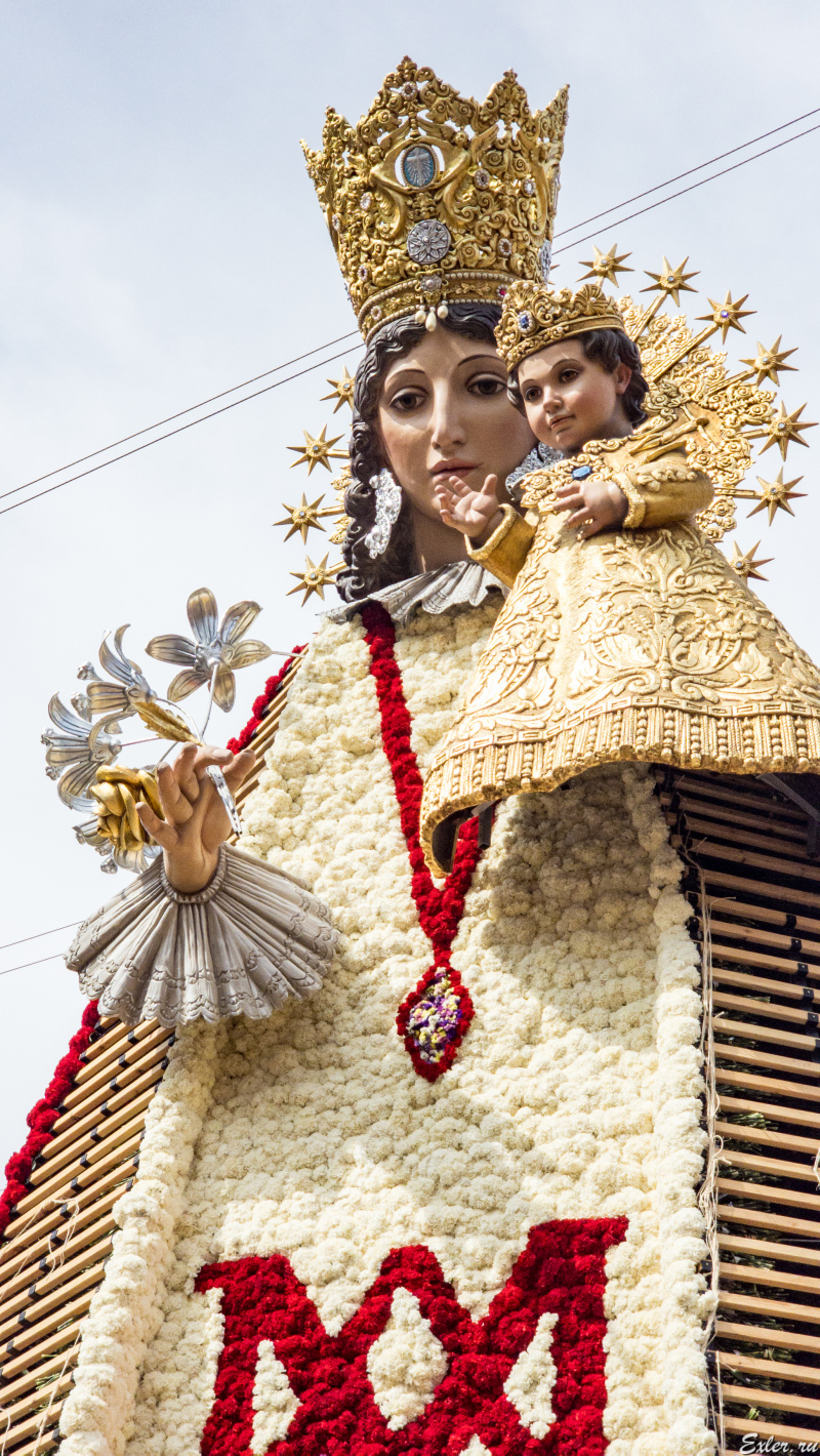 А вот это - статуя Богоматери, стоящая на одной из площадей. В течение всего праздника к ней приходят процессии людей в национальных костюмах, которые приносят кучу красных и белых гвоздик. Специальные люди при этом раскладывают цветы так, чтобы к концу праздника фигура вся покрылась цветами. И ее не будут сжигать: будут ждать, пока не завянут цветы.