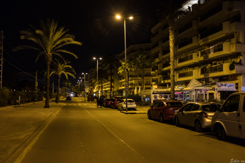 Ночная Пинеда-де-Мар. Слева - пляж и морской променад.