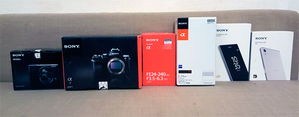Побывал в компании Sony, появились вот такие гаджеты на тест - скоро будут обзоры: фотокамера Sony RX100 IV, фотокамера Sony A7II с объективами FE24-240 и фиксом Цейсом 24 мм 1,8, смартфон Sony Xperia Z5 и Sony Xperia Z5 Pro (который видео 4К поддерживает).