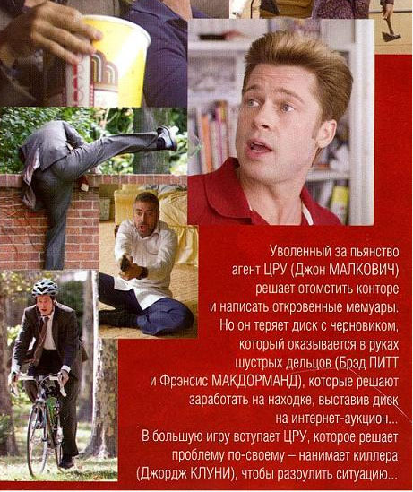 Совершенно изумительный анонс фильма "После прочтения сжечь". Казалось бы, зайди на официальный сайт, возьми оттуда официальный анонс - и все дела. Так нет, безвестный аффтар решил по полной напрячь фантазию, в результате чего диск выставлен на аукцион, а тихий аллергический развратник вдруг превратился в киллера.
