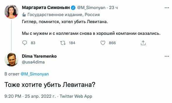 Интересней, кажется, другое: посерьезней обсуждается, что это как раз внутрироссийский "знак" пропагандистам немного урезать осетра. Потому как сакральная жертва из их рядов - хорошее зрелище для аудитории, питаемой как известно зрелищами, помимо хлеба. И возможно Соловьев как раз сильно задумался, а не свалить ли ему куда подальше, на манер того же Невзорова. А может и не только он, а и вся эта киселевско-шейнинская стая. Потому что одно дело, когда ты телеведущий с многомиллионными доходами, и другое - кабанчик на заклание во имя тех же рейтингов.