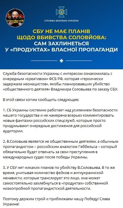 Соловьёв 23 апреля в своей программе говорил: "(президент Украины Владимир) Зеленский на меня пожаловался и попросил, чтобы со мной разобрались". В понедельник он заявил РИА Новости, что "благодарит сотрудников ФСБ за то, что горе не пришло в его дом сегодня". (Отсюда.)