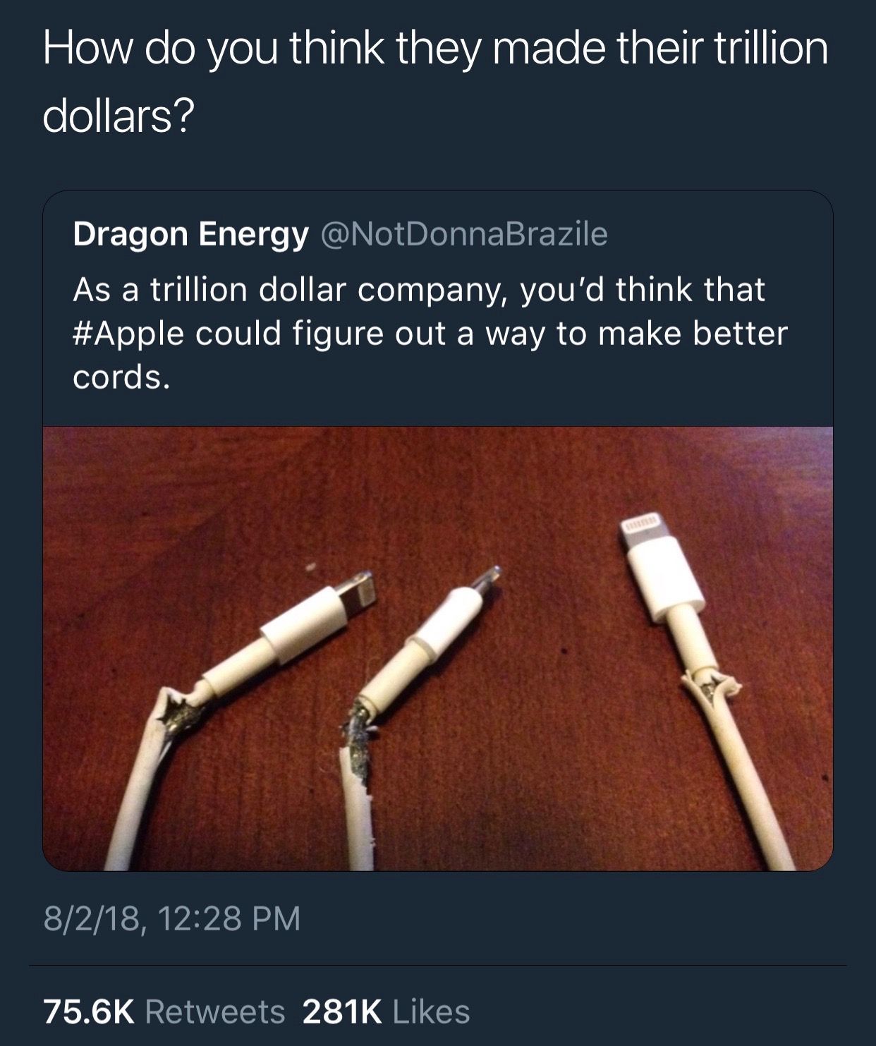За все время было 6 айфонов, 4 айпада и два мака. Ни разу ни один провод не порвался. Что я делаю не так?