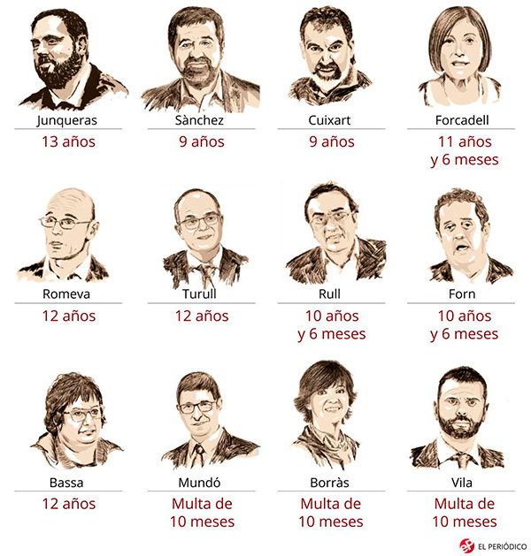 Максимальные 13 лет тюрьмы получил бывший замглавы правительства Каталонии Ориол Жункерас. Еще трое получили по 12 лет, один — 11,5, двое — по 10,5 и двое — по девять лет. Трое обвиняемых получили по году и восьми месяцам запрета на определенный род деятельности.