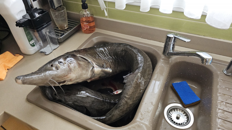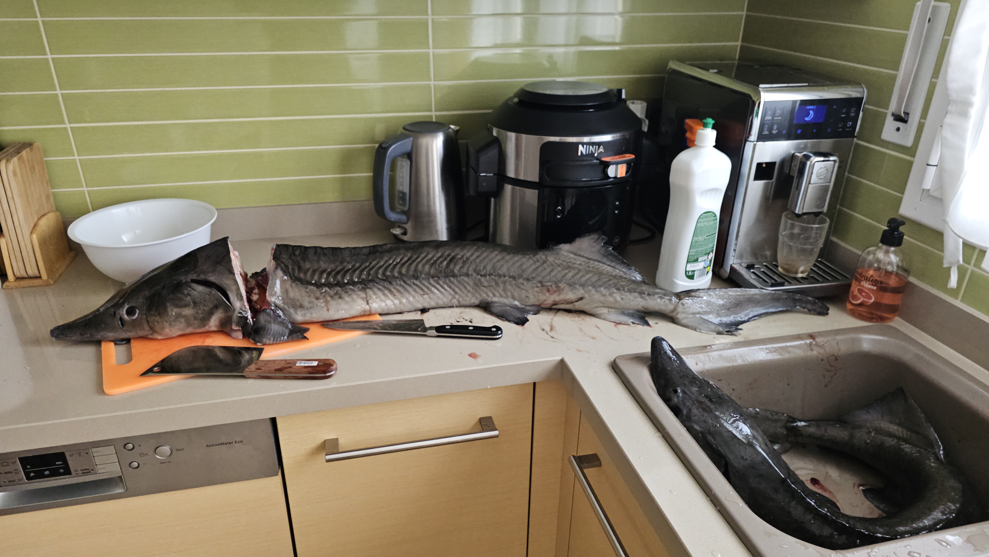 Осетр на столешнице смотрит на Алекса укоризненно.