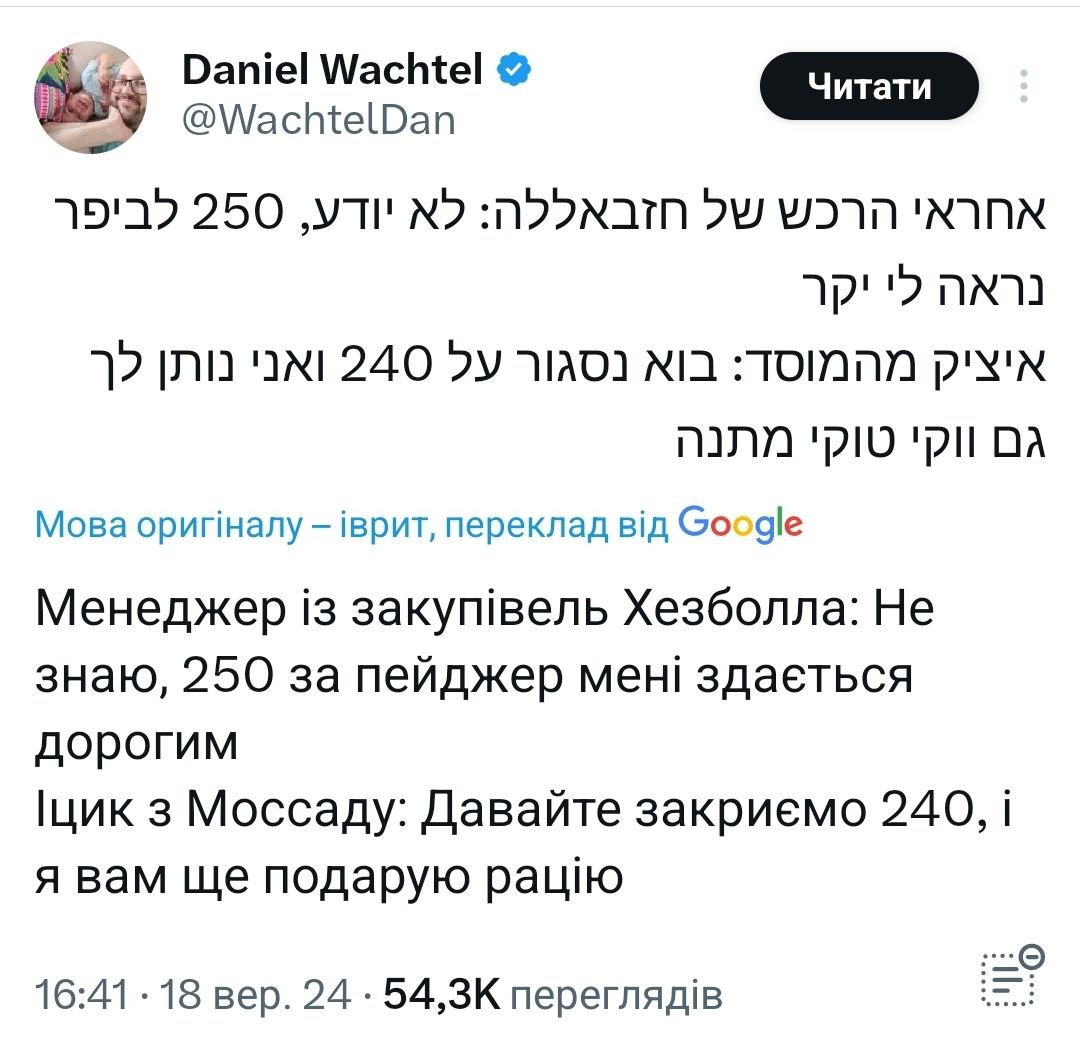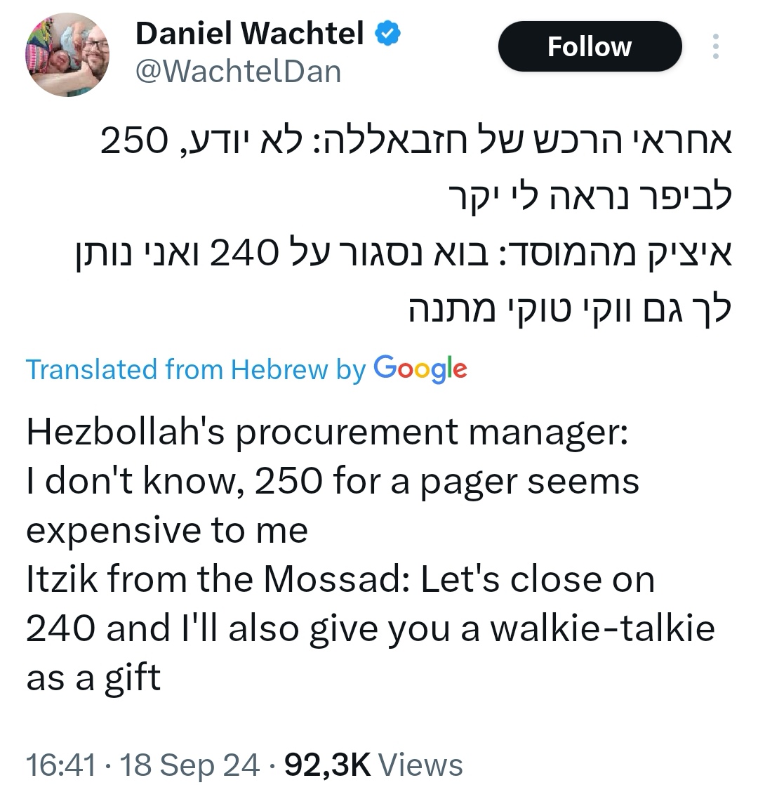 Ну что, на следующий день после взрывов пейджеров пришел черед и раций, используемых "Хезболлой" - "Israel detonates Hezbollah walkie-talkies a day after pager attack".