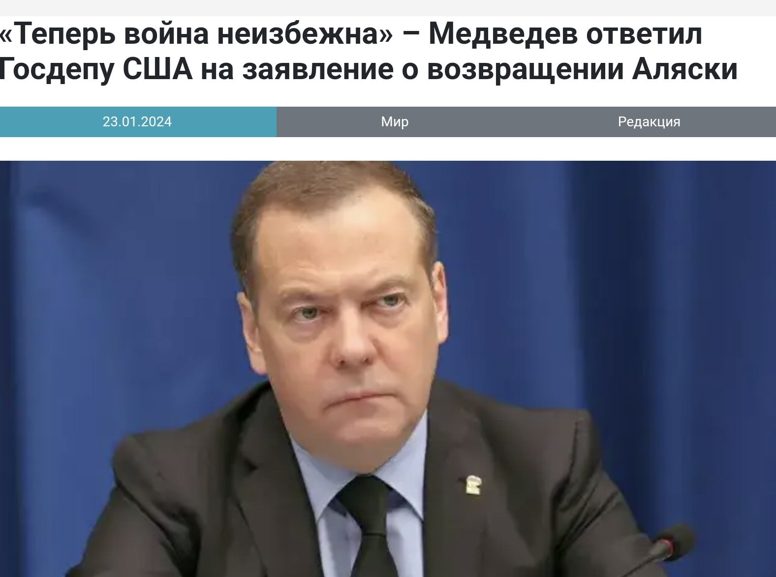 «По словам представителя госдепа, России не вернут Аляску, проданную США в XIX веке. Вот и все. А мы-то ждали, что ее вернут со дня на день. Теперь война неизбежна», – написал Медведев.