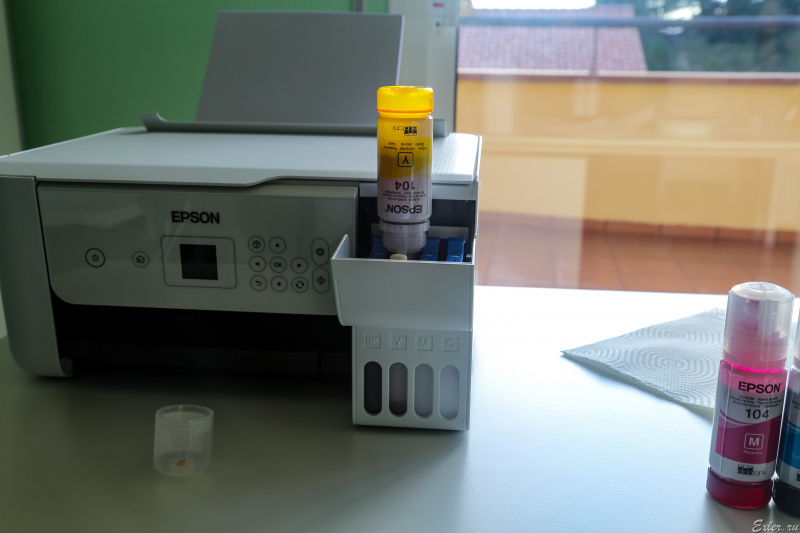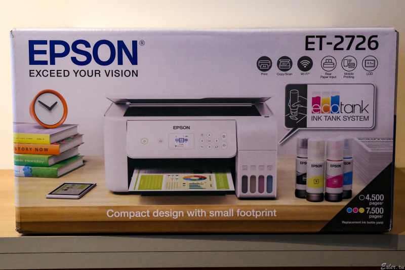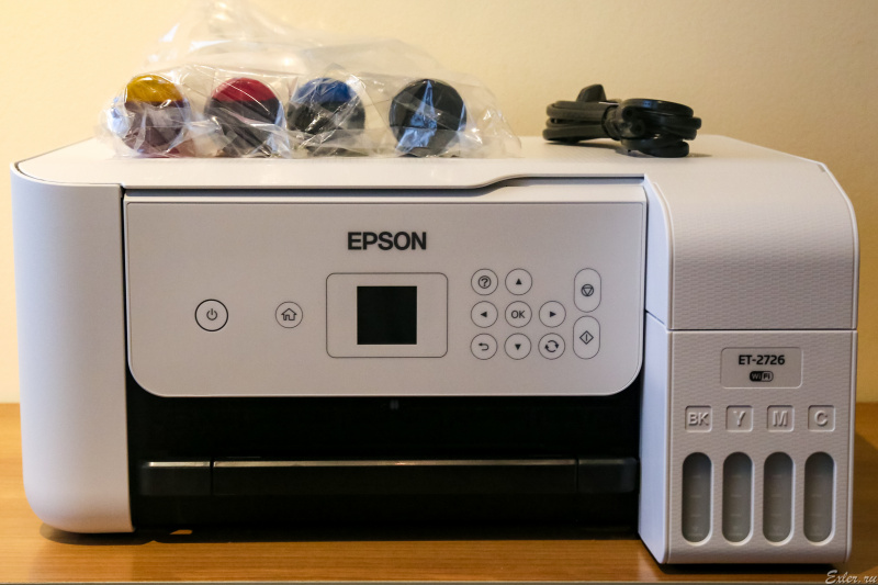 Прибыл мой Epson EcoTank ET-2726. В Испании он стоил €229, в России на Яндекс.Маркете продается за 24186 рублей. EcoTank - это система непрерывной подачи чернил, то есть здесь нет никаких дурацких картриджей, а чернила просто заливаются в соответствующие емкости, когда потребуется. Это значительно дешевле, чем картриджи, а кроме того, говорят, что тут намного меньше проблем с засыханием головок, особенно если принтер вообще не выключать (в этом случае он сам проводит необходимые процедуры, если долго стоит без работы).