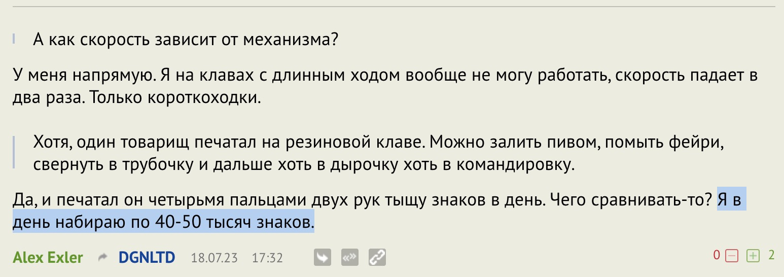 Тем более отвратительна эта клавиатура, даже глядя на фотку видно, что ось положения левой руки, несмотря на декоративный изгиб, должна быть направлена влево, чтоб один и тот же палец работал по R, F и V. Вообще, это, конечно, гениально разломать и изогнуть клавиатуру якобы для эргономики, но при этом сохранить межрядовый сдвиг клавиш. Напоминаю, он появился чтоб на механических печатных машинках рычажки разных рядов не мешали друг другу. Если уж ради эргономики ломаем расположение клавиш, нафига тащить с собой этот сдвиг?