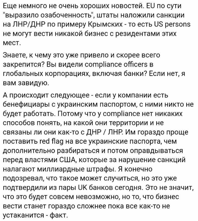 "Зарубежный бизнес в целом будет придерживаться санкционных режимов США" - вот это смешно было. Почитайте, какие штрафы получал ДойчеБанк за неполное следование наложенным США ограничениям эмбарго. Там штрафов менее нескольких миллиардов долларов вообще не фигурирует, не считая потенциальной уголовной ответственности для руководителей. Многие ли владельцы бизнесов вообще готовы на такой риск и какова должна быть премия, чтобы они на него согласились?