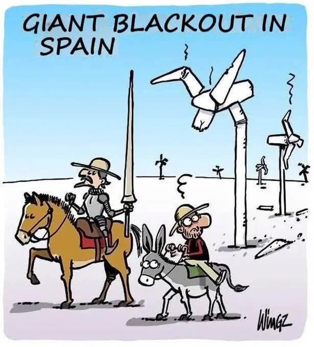 Так, наверное, где-то и произошло, но судя по масштабам ущерба, возобновляемая энергетика не смогла не то, чтобы полноценно (это невозможно), но даже заметно заменить вышедшие из строя пилоны. Теоретически, крупные потребители, к примеру аэропорты и железные дороги, действительно останавливаются, а все остальное, с учетом того, что инцидент случился в солнечный, но не супержаркий день, и днем, должно продолжать работать, как минимум частично, потому что на бумаге Испания генерирует солнечной энергии просто до фига, примерно половину потребностей покрывает. Покрыли? Да что-то не заметно.
