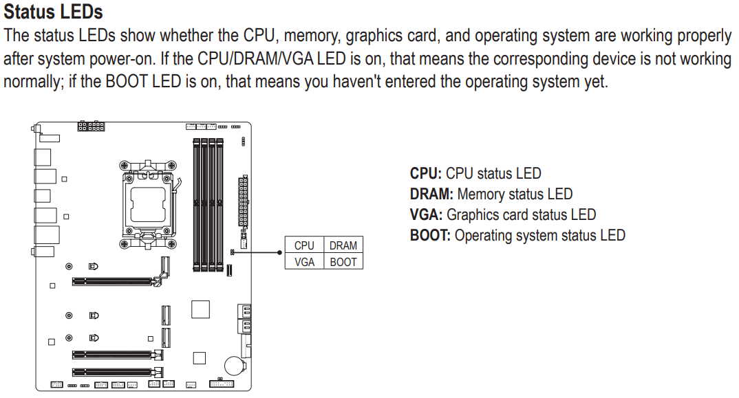 Поскольку в мануале, который вы читали, про эти индикаторы ничего не сказано, найдите точную модель материнской платы и поищите на официальном сайте производителя или на форумах поддержки. Очень часто подобные симптомы обсуждаются на профильных ресурсах, и там могут подсказать точное значение мигающих индикаторов.