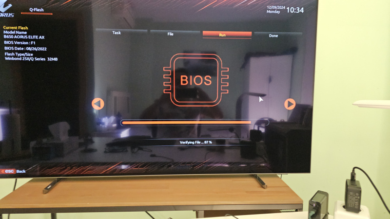 Иногда у материнок бывают разные ревизии и биос может немного отличаться. Как тут уже советовали, лучше сбросить биос и обновить его из винды через Gigabyte Control Center. У гигов и MSI обновление из винды работает четко. (во время обновления лучше подсоединить монитор по HDMI кабелю, не все мониторы выводят процесс обновления по DP)