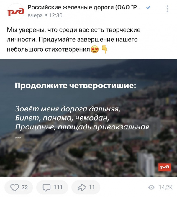 Пиарщик РЖД неожиданно вспомнил, что ему за что-то там деньги платят, после чего разродился вот таким потрясающим креативом.