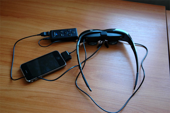 Модель 920 - вот подробная спецификация. Стоит эта штука в Штатах $349,5. В комплект входят: сами проекционные очки, композитный AV-кабель, композитный AV-кабель для iPod/iPhone, наушники с тремя видами насадок, проводной пульт управления, руководство.