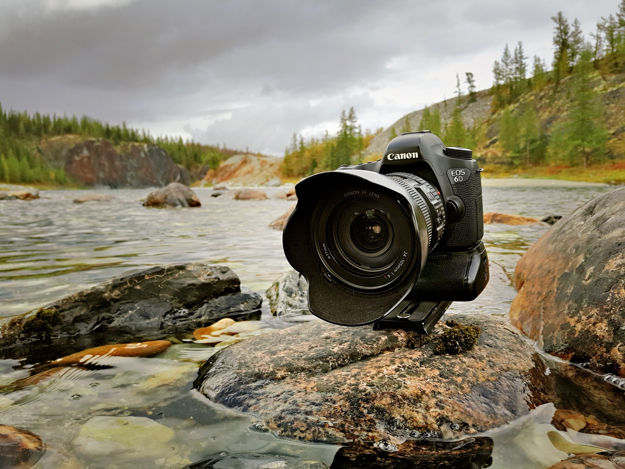 смешно. тушка 6Д+ обьектив 24-105+батарейная ручка = вес около 3х кг, все это на кадре балансирует на 2кв сантиметрах опоры с риском свалиться с камня в воду( цена падения более 100 тысяч рублей)