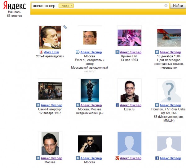 Яндекс выдает три страницы профилей "Алекс Экслер". Четыре профиля из них действительно мои (из них используются только два - в ЖЖ и в FB), все остальные - люди, которые по не вполне понятной для меня причине назывались моим ФИ. И даже один американец, который потенциально мог бы оказаться действительно Алексом Экслером, таковым, как выяснилось, не является.