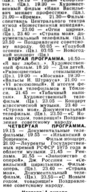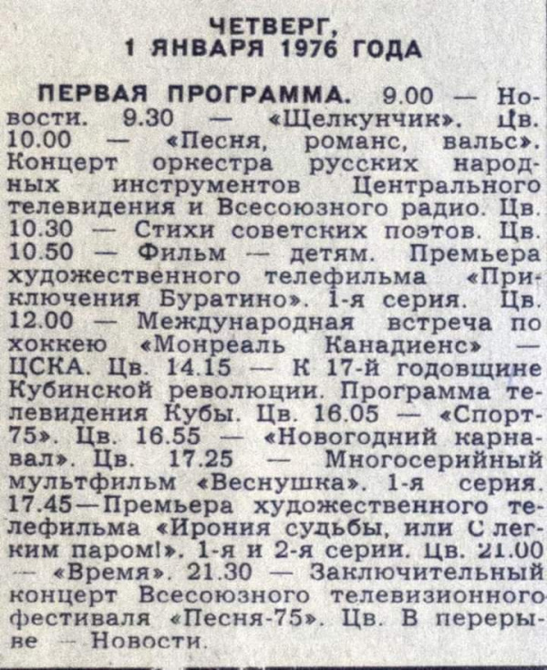 Программа передач 1 января 1976 года, когда впервые показали "Иронию судьбы, или С легким паром". Кстати, как выяснилось, в этот же день впервые показали первую серию другого культового фильма "Приключения Буратино".