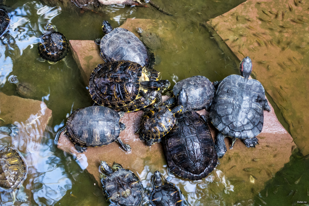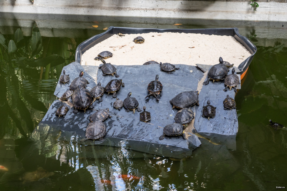 Здание центрального железнодорожного вокзала. Половину старого строения превратили в красивый цветущий сад с черепашками.