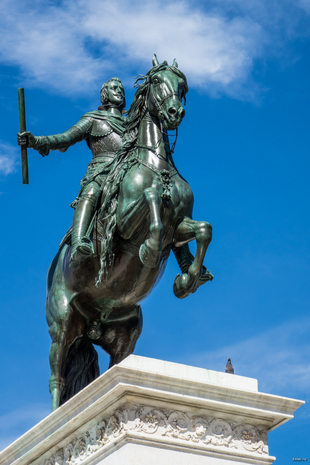 Как и большинство статуй на вздыбленных конях, памятник Филиппу в Мадриде имеет все же 3 точки опоры - 2 ноги и хвост лошади. Медный всадник - тоже. А вот памятник Николаю I в Питере, перед Исаакиевским собором - стоит только на 2-х ногах.