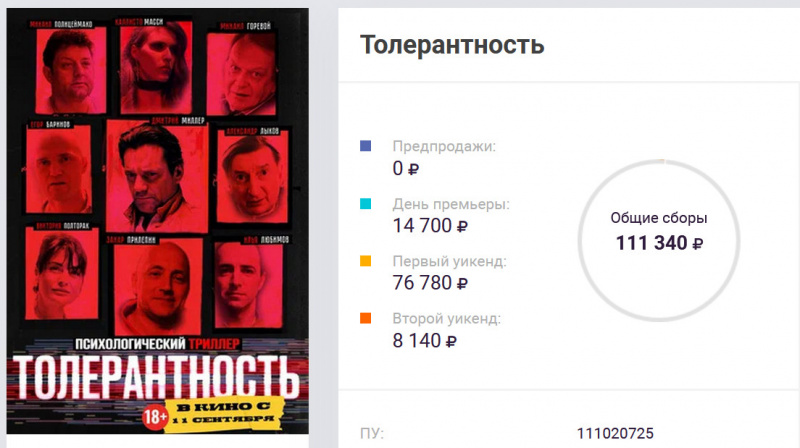 Так вот, на экраны это кинцо вышло 11 сентября. В день премьеры заработало аж 14 тысяч рублей. В первый уикенд - 76780 рублей, менее тысячи долларов. За весь второй уикенд - 8140 рублей. Далее его, судя по всему, с проката и сняли - какой смысл прокатывать то, что никто смотреть не собирается.