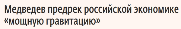 Медведев: "Санкции и гравитация - вот что мешаем нам выйти на устойчивый рост. Санкции на самом деле не существенны, сильно экономике навредить не могут, вот с гравитацией надо что-то решать. Дмитрий Олегович, вы же тоже с ней сталкиваетесь, космическая отрасль, проблемы определенные, гравитационные. Опять же покорение Марса, где гравитация себя покажет в полную силу. Жду от вас предложений до конца недели. Мы вчера с Владимиром Владимировичем это обсуждали, новое поколение оружия - в какой-то мере смогли ее преодолеть там. Нельзя и про социальную сферу забывать, самое главное. Гравитация усложняет реализацию программ "Доступная среда", ввод жилья. Надо работать - вместе, сообща, так мы сможем преодолеть."