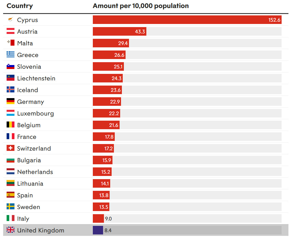 В статье "The UK has one of the lowest rates of asylum applications in Europe" приводятся данные о том, какое количество прошений об убежище из расчета на 10 тысяч человек приходится в разных странах Европы. Самая низкая цифра - 8,4 - у Великобритании. Самая высокая - что меня сильно удивило, тем более что эта цифра еще и в три раза выше максимального показателя по Европе - у Кипра.