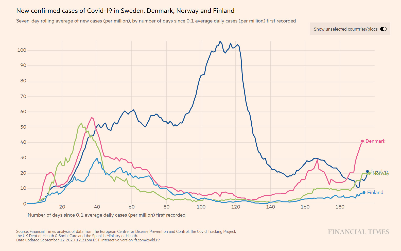 Отличный график, показывающий что в результате отсутствия карантина вторая волна в Швеции вышла на пик в середине июня, впереди Европы всей.