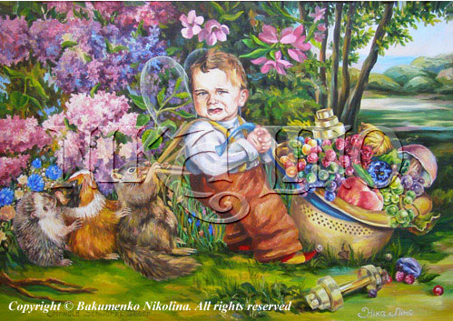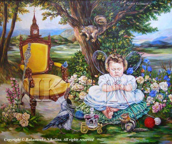 Харьковская художница Николина Бакуленко рисует пухлощеких эльфов. Однако она вовремя сообразила, что просто пухлощекие эльфы - мало кому нужны. Ну, китч и китч, таких эльфов, отшлепанных на специальном принтере, на любом уличном вернисаже - хоть ложкой зачерпывай. Хочешь - картину, хочешь - гобелен, хочешь - кружка или подстаканник.