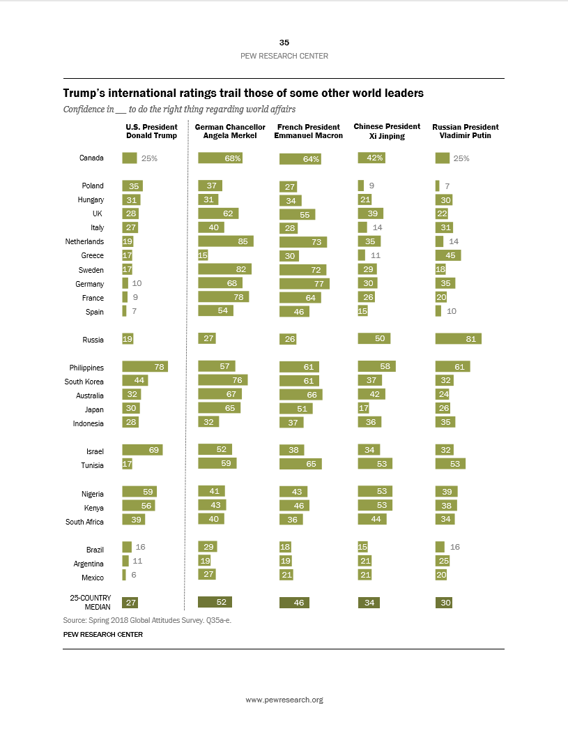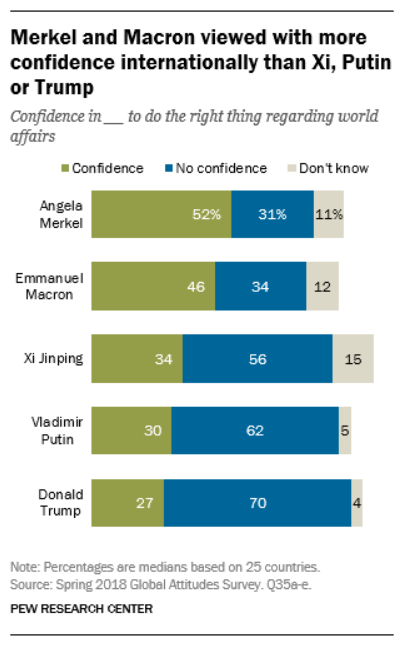 Кстати, ни штатов, ни Китая в их выборке нет, а вот Россия, Германия и Франция есть. Причем максимальный рейтинг у Макрона в Германии, у Меркель в Нидерландах, а у Трампа, вообще, на Филиппинах... Впрочем, эти филиппинцы, похоже, всем подряд доверяют.