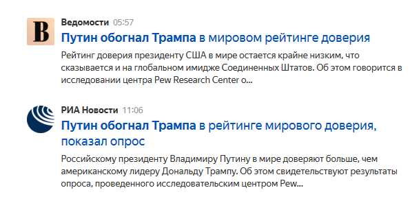 А что не так с заголовками? Ну вот, например, NHK пишет, что Трамп отстал от Путина: Survey: Trump inspires less confidence than Putin - и в чем разница? Про Меркель, видимо, никому не интересно читать...