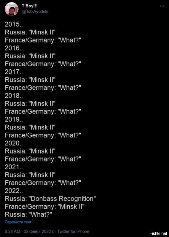 Ну что, приходится признать, что Путин опять всех переиграл? Впрочем, стоп, ведь признание этих ЛНР-ДНР автоматически означает нарушение Минских соглашений, выполнения которых требовала Россия. Причем этот идиотский ультиматум Штатам прежде всего выдвигался для того, чтобы Штаты надавили на Украину и потребовали выполнения этих соглашений, которые для Украины практически неприемлемы.