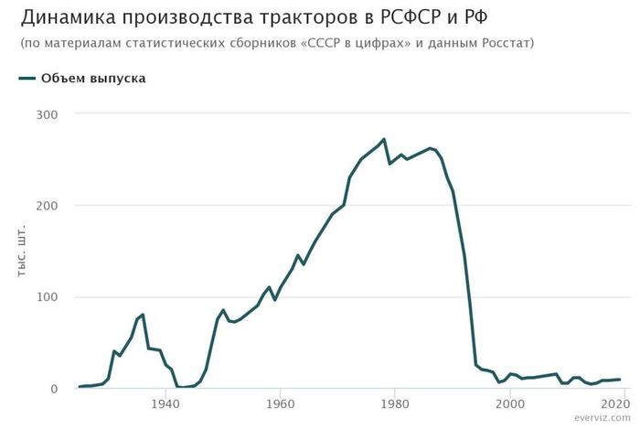 Вот цитатка "В наследство от Советского Союза современная Россия получила более 10 индустриальных гигантов, однако за время активных реформ производство тракторов снизилось более чем в 30 раз, и сегодня в физическом исчислении объемы выпуска соответствуют послевоенному периоду." (зы: сейчас уже не соответствуют, сейчас уровень 20х годов)