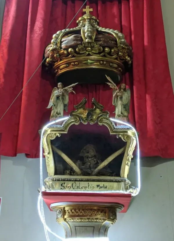 Кости святого Валентина хранятся в небольшой церкви в Чуэке, которая служит приютом для городских бездомных. Внутри золотого футляра на красной бархатной подушке лежат череп и другие кости, которые были подарены Карлосу IV Папой Римским после обнаружения их в римских катакомбах. Как Папа узнал, что это вообще кости святого Валентина - доподлинно неизвестно, но во многих церквях Испании хранятся кости и черепа святого Валентина - он вообще был мужик, судя по всему, довольно костлявый.