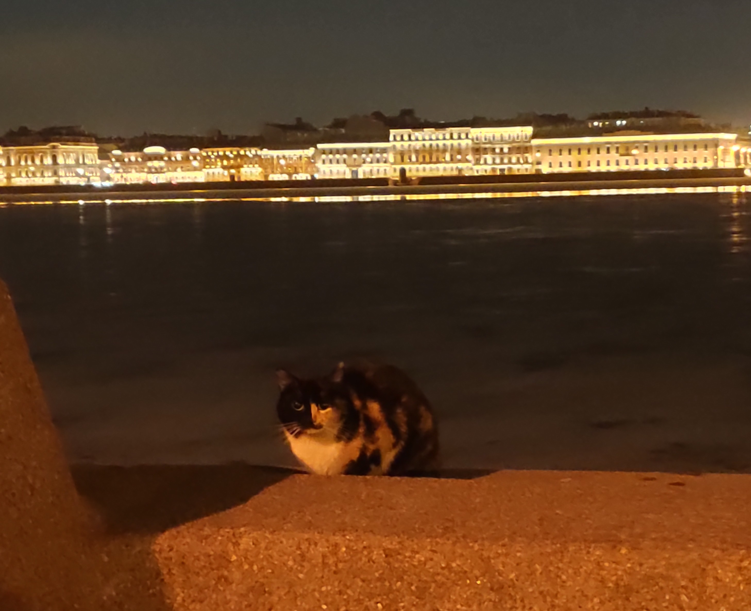 один на набережной. Охранник на корабле все за мной смотрит куда б не пошел. Включил ему "Что тебе снится, крейсер Аврора" с телефона на громкую, помахал. Он отвернулся, кажется, с отвращением.