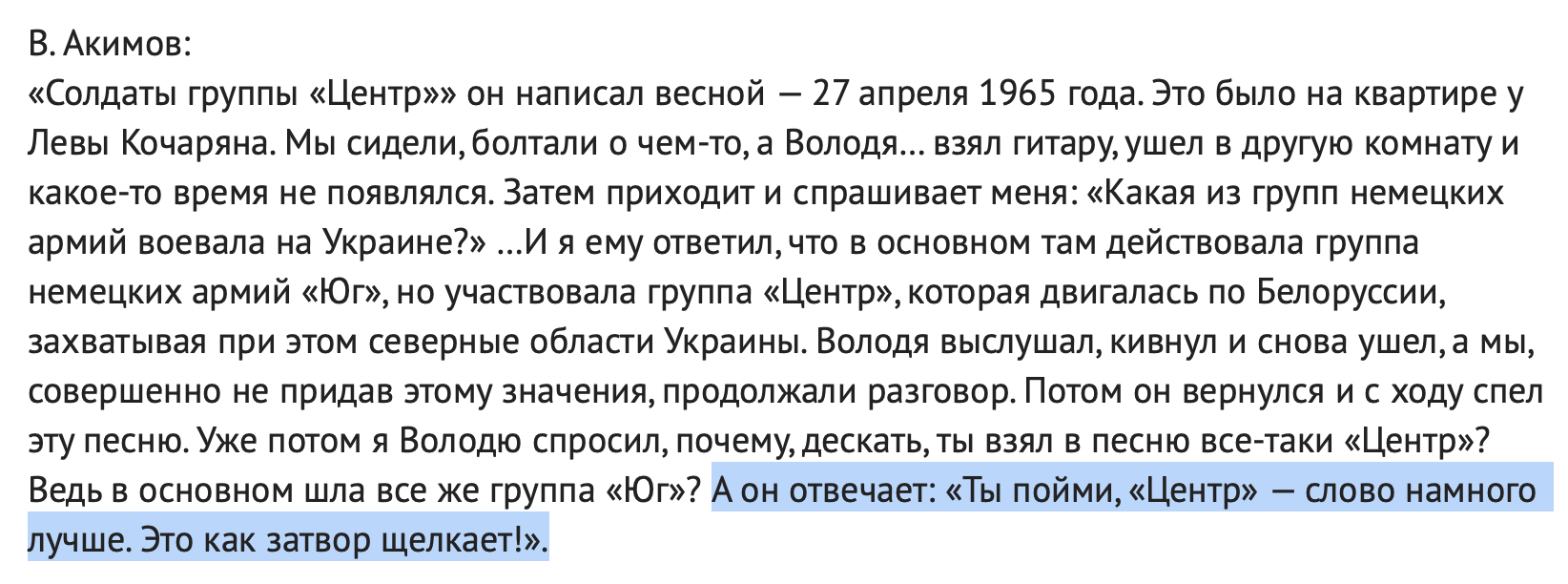 По той же причине Высоцкий поет про группу "Центр", хотя в основном там действовала группа "Юг".