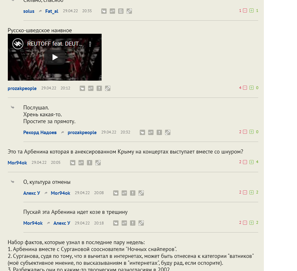 И я как раз ей в ответ послал ссылку на эту песню Арбениной. Та выступила однозначно против войны, за что ей уважуха.