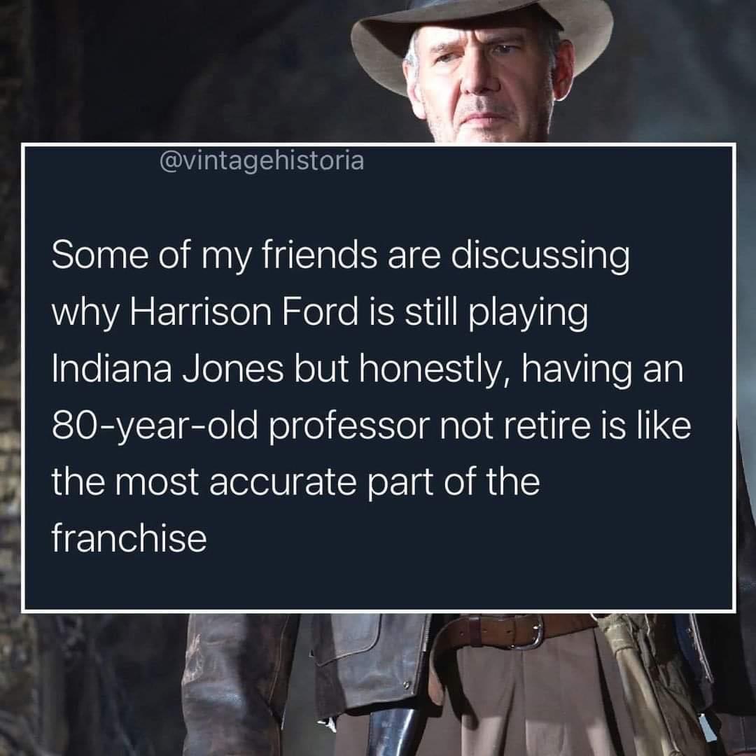 (перевод: мои друзья обсуждают, почему это Харрисон Форд до сих пор играет Индиану Джонса? - Ну если честно, 80-летний профессор, который до сих пор не ушел на пенсию - это самая близкая к реальности линия этой франшизы. )