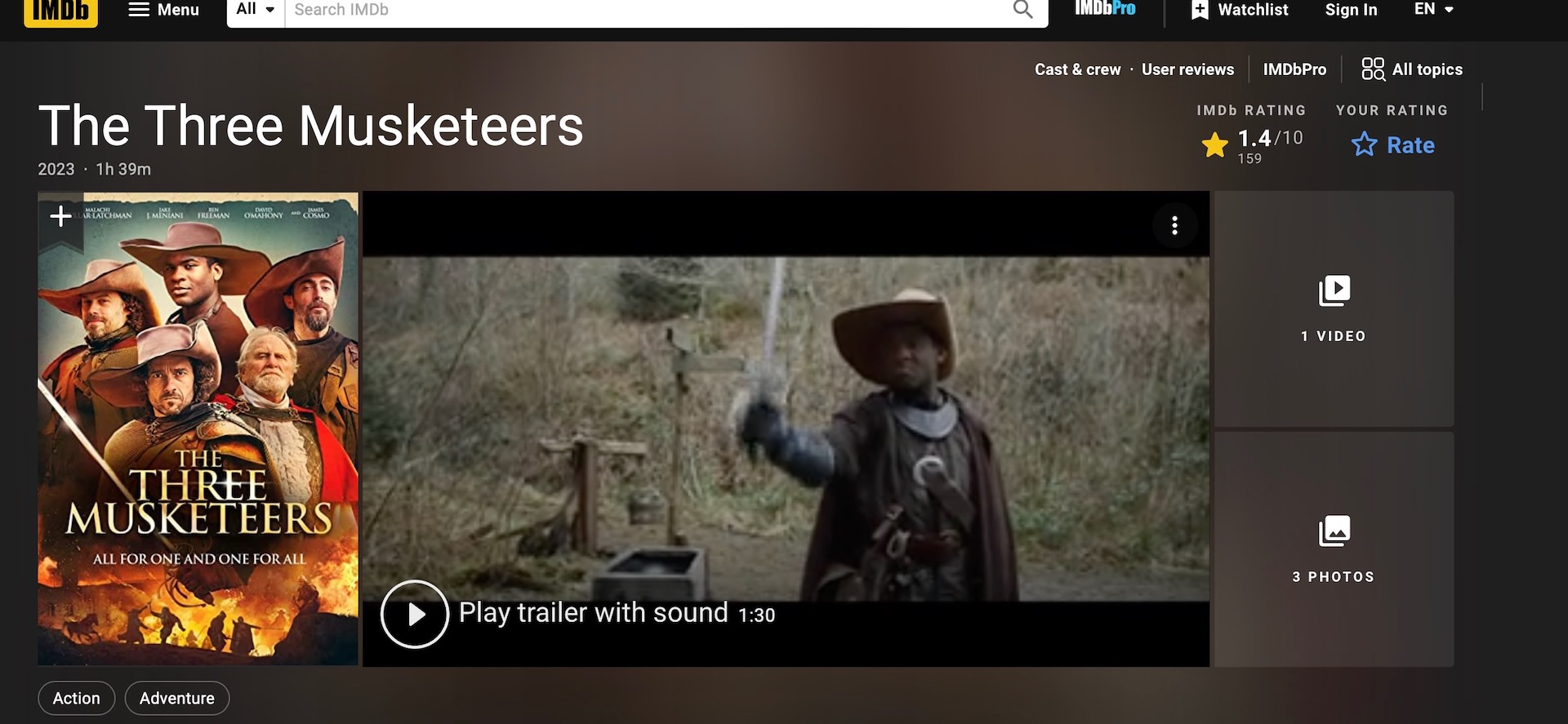 Это не те "Три мушкетёра", а мокбастер. Те состоят из двух частей, вышла первая: m.imdb.com