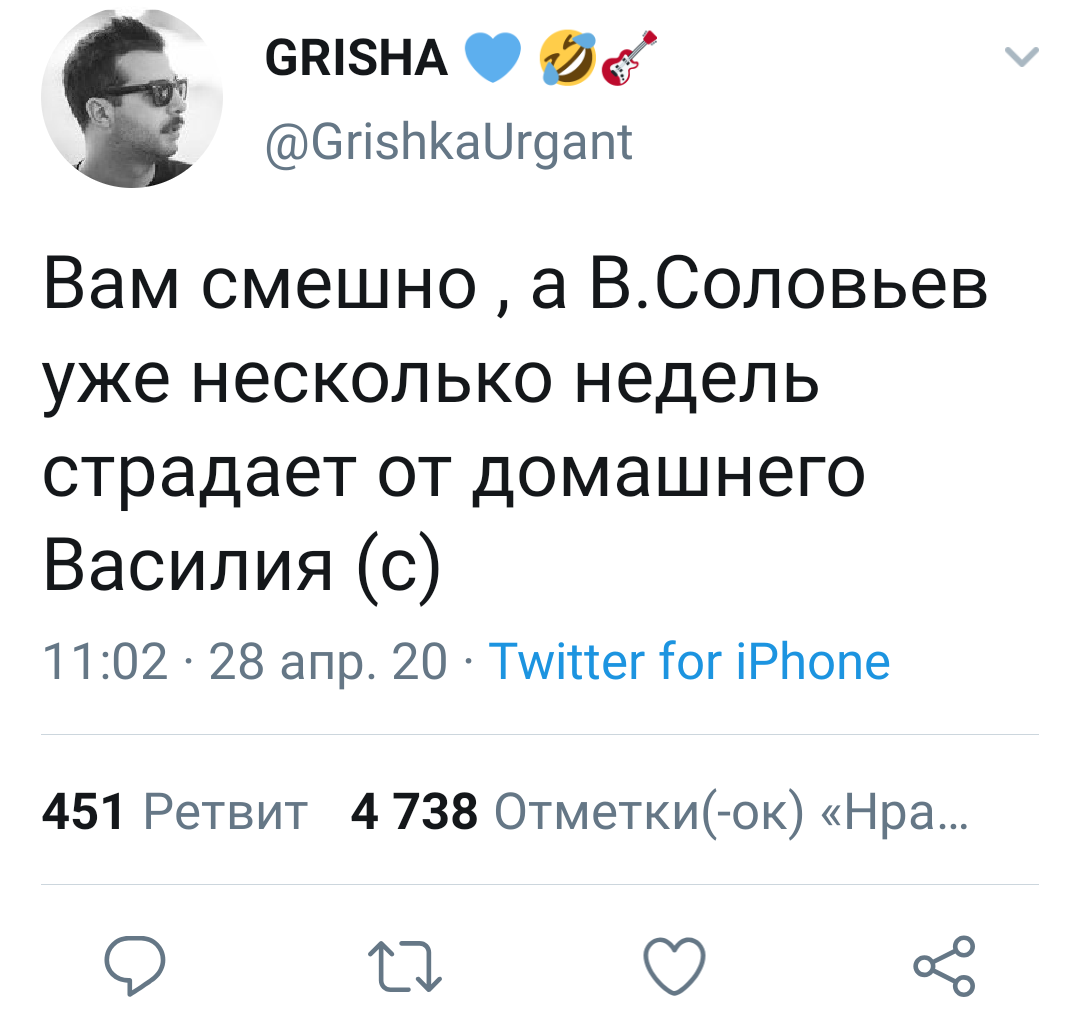 Соловьев - счастливый человек. При абсолютно зашкаливающей мании величия он совершенно не понимает, каким законченным клоуном он выглядит со стороны. Если бы хоть раз себя увидел чужими глазами - вот бы он ох...ел.