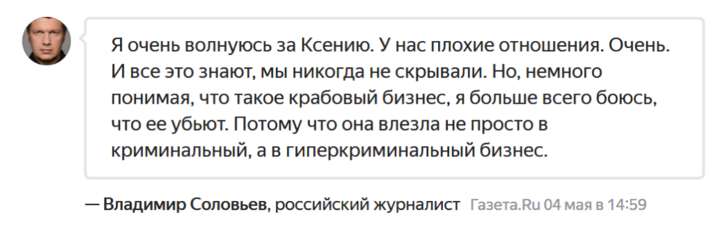 По его мнению, это происходит из-за того, что «разные барышни, еще вчера взасос любившие одну кремлевскую башню», решили заработать на сетках Telegram-каналов и теперь видят со стороны него и его друзей конкуренцию. «Поэтому начинаются сливы, вранье, подливы, немножко подмочить Соловьева. Потому что им выгодно, потому что они привыкли быть ландскнехтами (наемными солдатами — прим. «Ленты.ру») — притворяясь, что они любят власть и помогают власти», — возмутился ведущий.