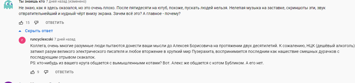 В комментариях под видеороликами Алекса вы также найдете человека, подписывающегося моим ником, но это не я.
