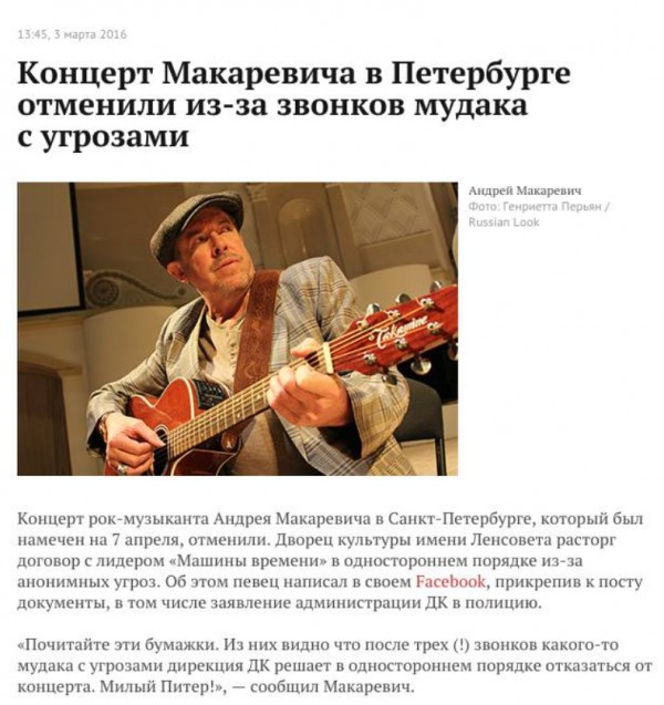 Все как обычно - размещена ссылка со скрином статьи с "неточностью" 😉, а толпа народу пошла в комментах обсуждать Макаревича (кстати, имхо, молодец), а не заметку и неточность. Ленту, кстати, тоже ничего до сих пор в заметке и фото не смущает.