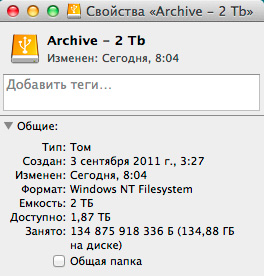 А главное - реальная скорость перекачки больших объемов с OS X на диск NTFS у меня получалась порядка 6 Гб в минуту! Это очень здорово, у меня на компьютере под Windows скорость меньше - порядка 5 Гб в минуту.